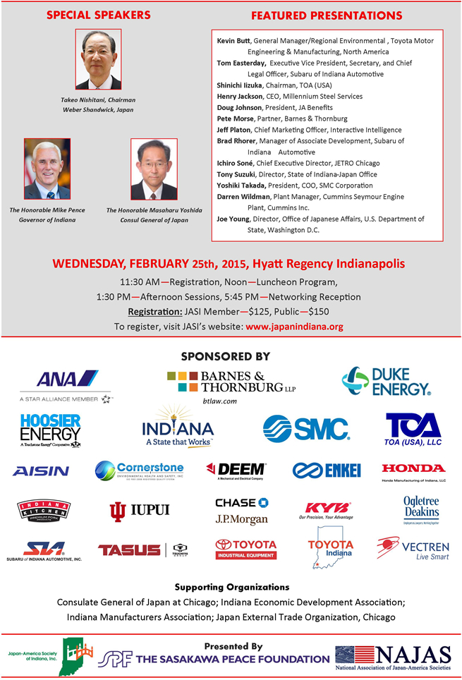 The Japan-America Society of Indiana presents the 2015 annual Japan Update Conference in partnership with the Sasakawa Peace Foundation and the National Association of Japan-America Societies (NAJAS). Representatives of the national network of Japan-America Societies will attend in conjunction with the regional NAJAS meeting hosted by the Japan-America Society of Indiana with the support of Barnes & Thornburg.