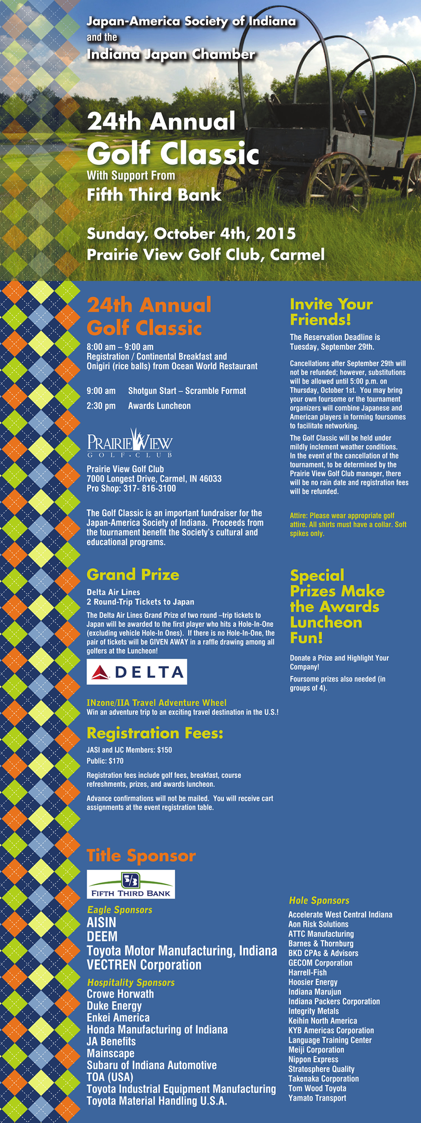 Registration is now closed for the 24th Annual Golf Classic to be held on Sunday, October 4th, at Prairie View Golf Club in Carmel. With more than the maximum number of players, the tournament is a sell-out. It’s a great situation for JASI but we regret having to decline players. We appreciate the enthusiasm of those who have registered early as well as the support of the many sponsors. A short “wait-list” is being created for possible cancellations; please contact Jeremiah Maxwell of the JASI office if this is of interest (jeremiah.maxwell@japanindiana.org). Thank you for your understanding, and we hope to see you next year.