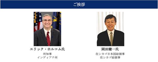 またプログラムの中でインディアナ州のエリック・ホルコム州知事と、在シカゴ日本国総領事の岡田健一総領事からご挨拶をいただきます。
