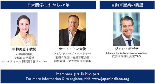 インディアナ日米協会では、第10回Japan Currentsシンポジウムを開催し、ビジネスと国際関係を予想する機会を提供します。今年の日米関係の展望、日米関係の重要課題、製造業の最新情報などをご紹介する予定です。